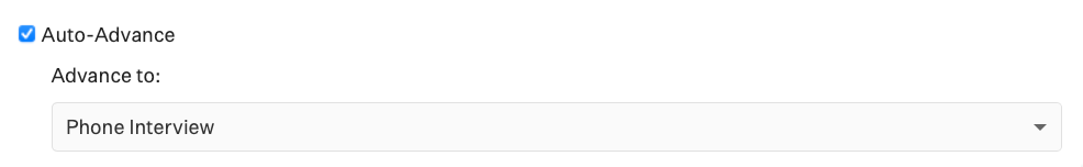 With auto-advance, your organization can set up application rules so that, based on an applicant's answer to a question, they will be automatically advanced to a specified stage in your Interview Plan.