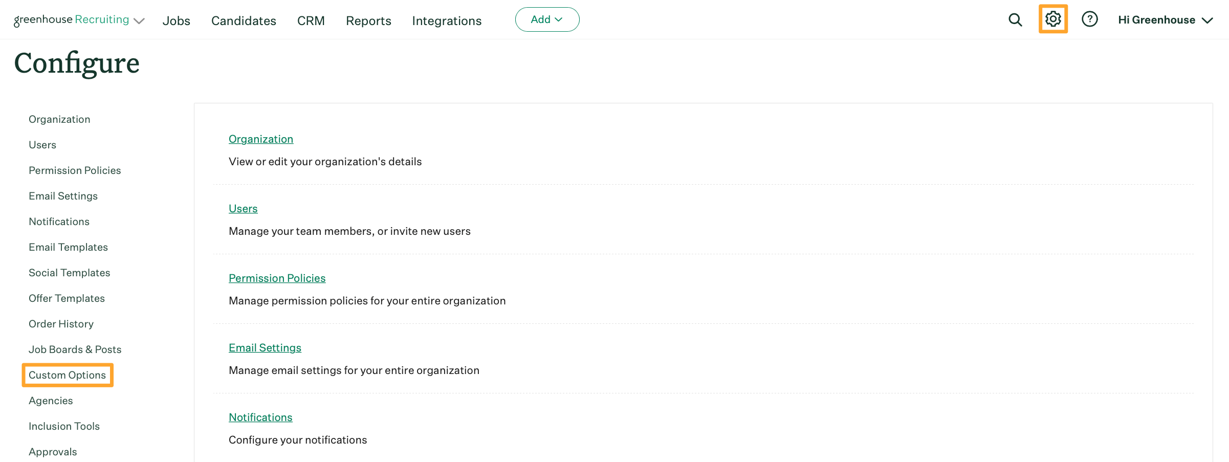To create a new candidate tag, click the Configure icon in the upper right-hand corner and navigate to Custom Options on the left-hand panel.