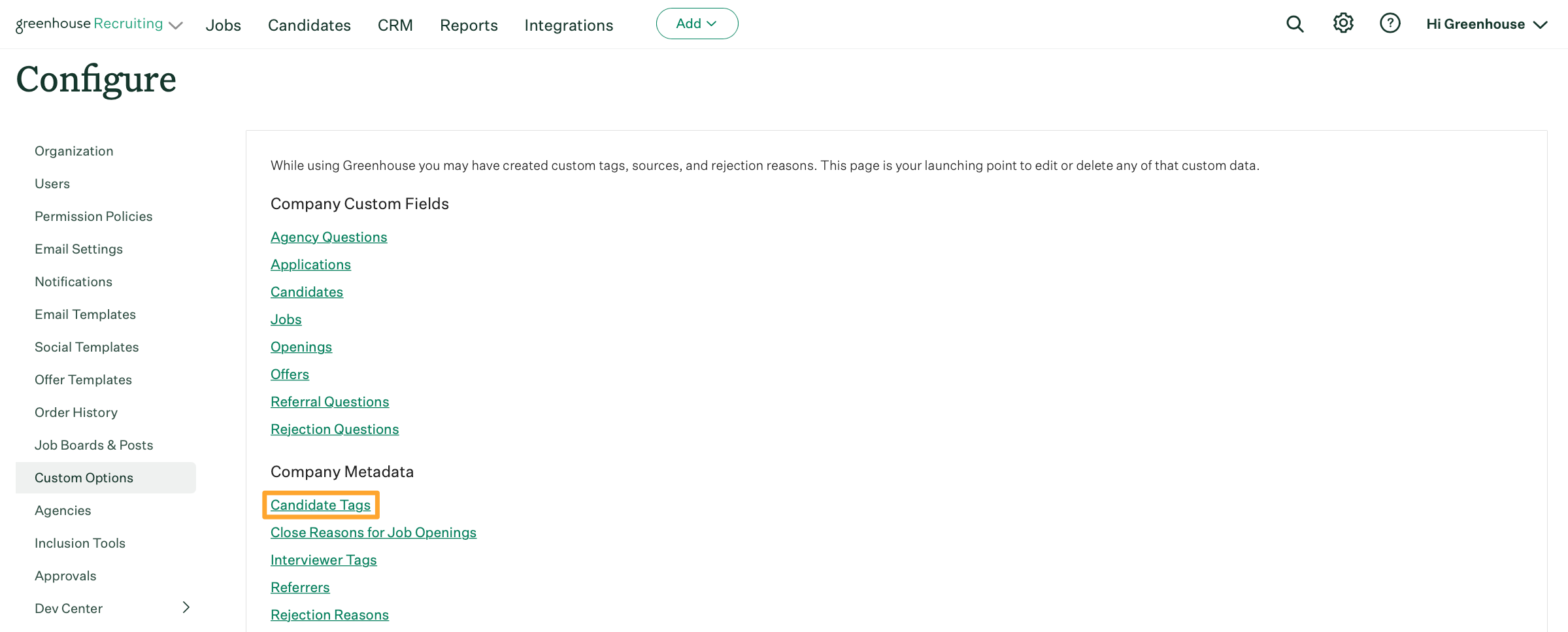 From the Custom Options page, click Candidate Tags under Company Metadata.