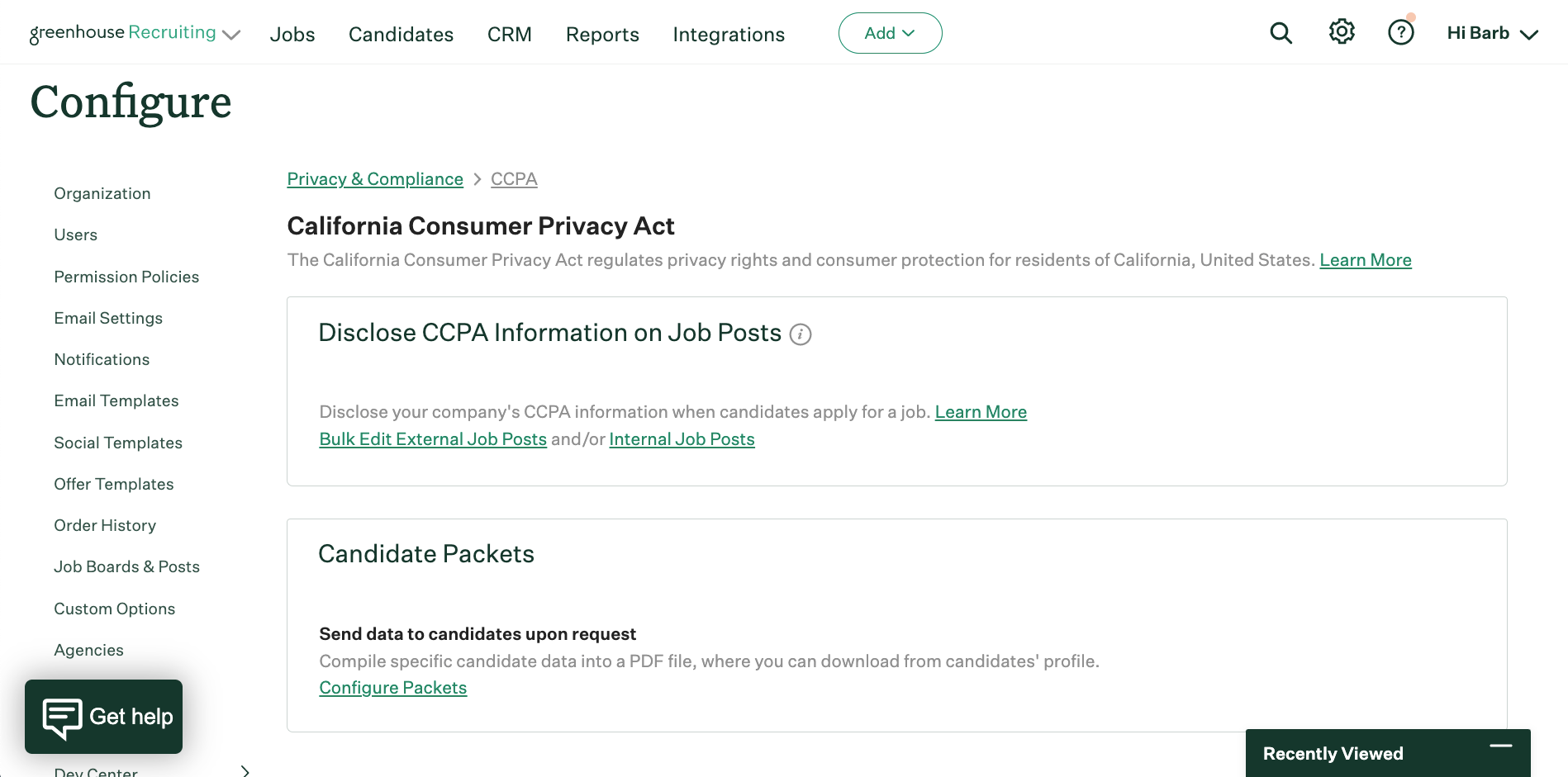 The California Consumer Privacy Act (CCPA) page outlines the features available in Greenhouse Recruiting to assist with CCPA compliance.