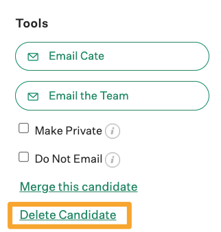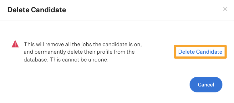 Note: Deleting a candidate profile removes all record of the candidate from your system, including record of the candidate in reports. This is a permanent action that cannot be undone.