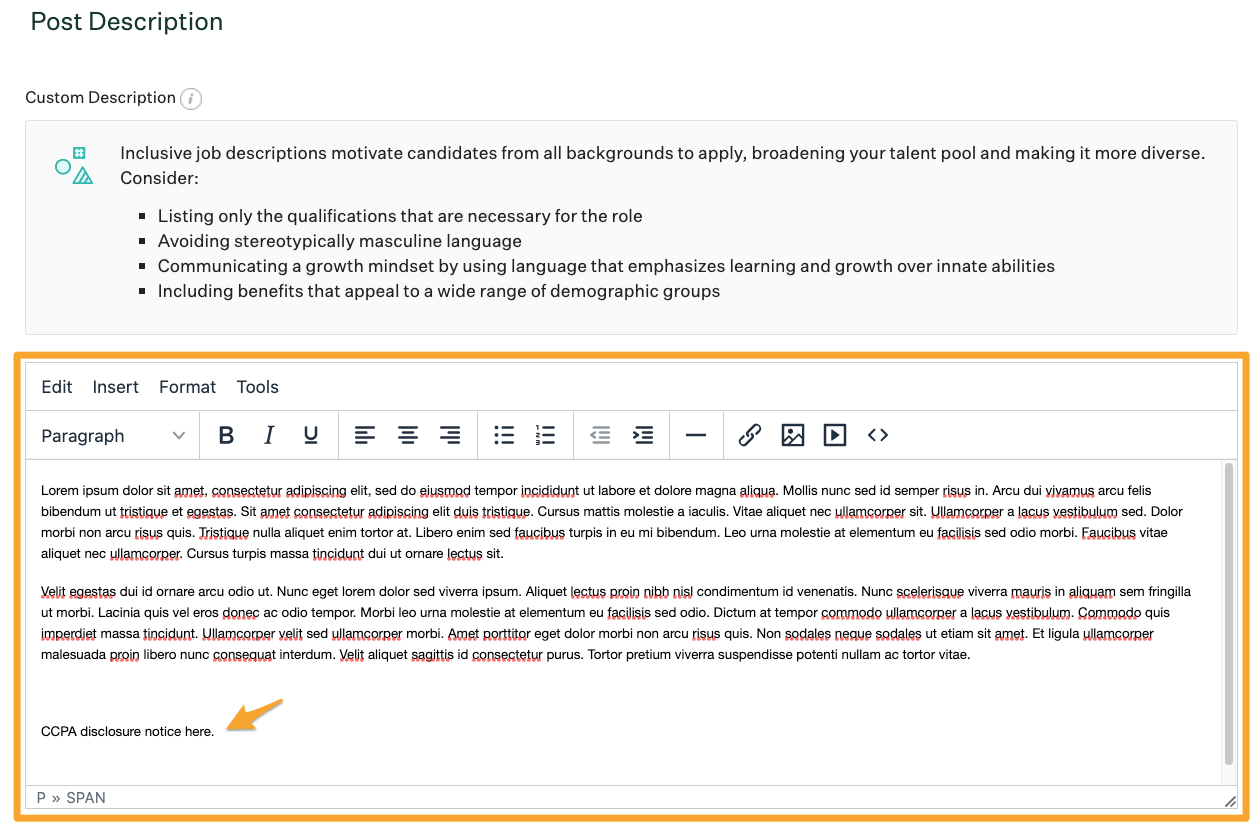 Repeat this process as necessary to add your organization's CCPA disclosure notice to all applicable job posts.