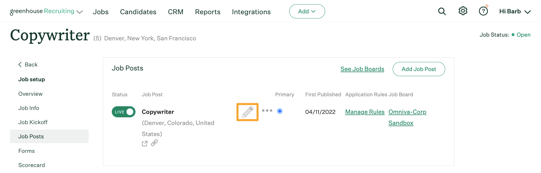 From the Job Posts page, click the Edit icon inline with a specific job post.