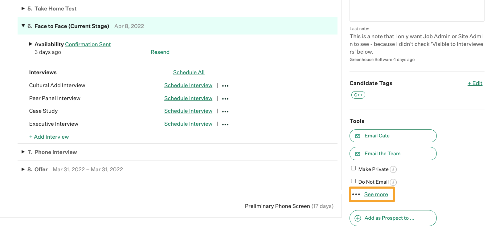 If a candidate has requested to have their information removed, navigate to the candidate's profile and click See more under the Tools section.