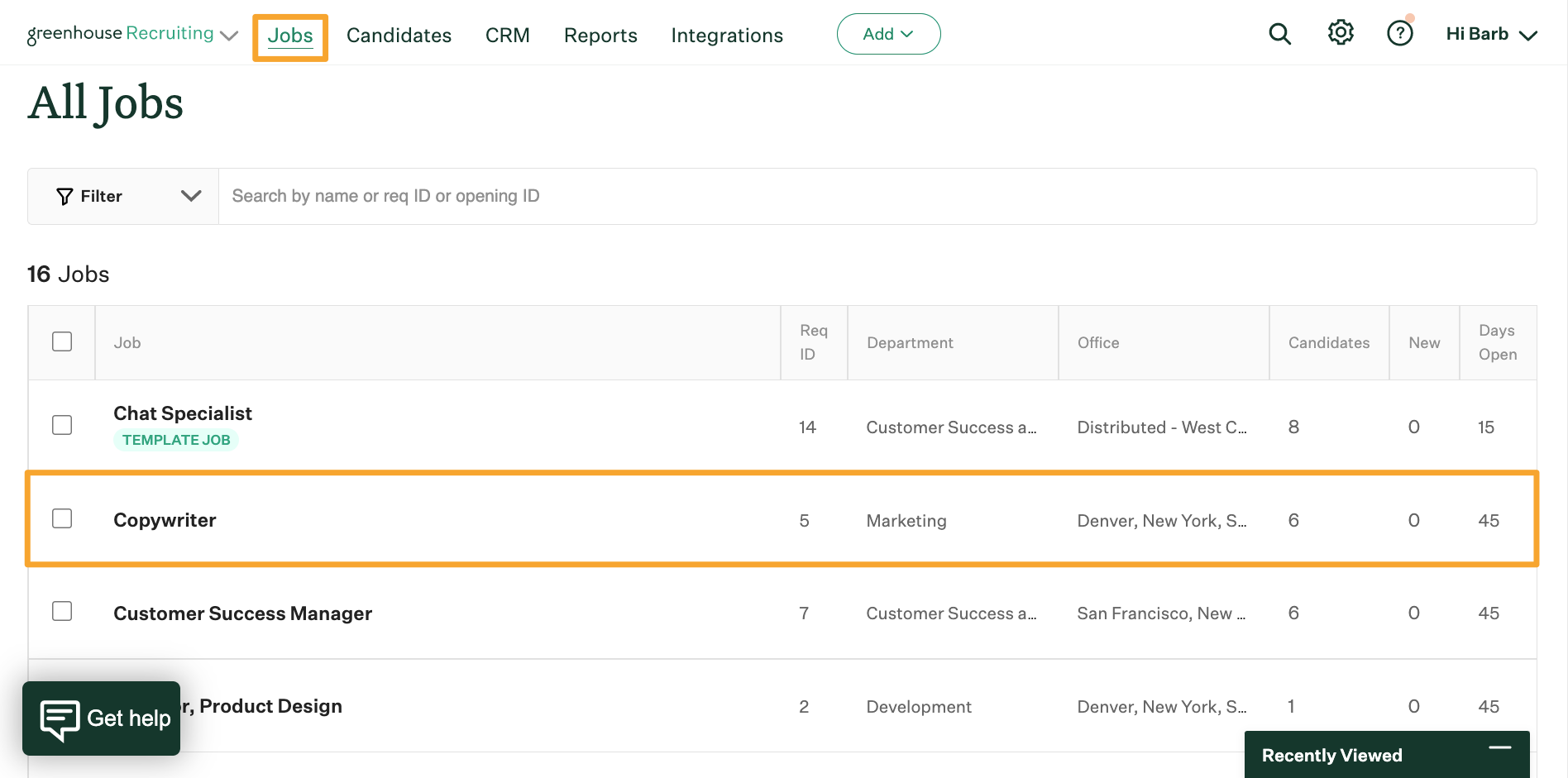 Alternatively, your organization can add a CCPA disclosure to a single job post at a time. To do this for an existing job post, click Jobs from the navigation bar. On the subsequent page, click the job to be edited.
