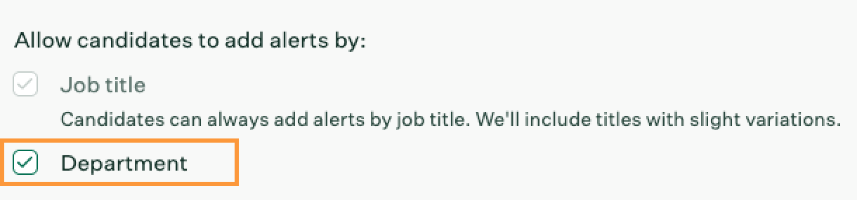 By default, candidates can create job alerts for job titles. We'll include job titles with slight variations in the results. For example, job alerts for "Project manager" will also include results for "Senior project manager."