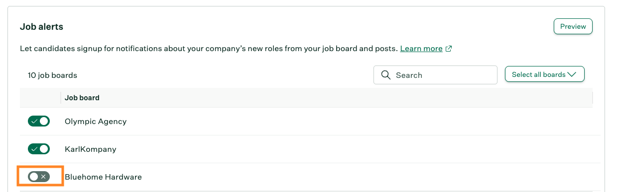 When you're ready, select the boards where you'll allow candidates to sign up for job alerts. Your changes will instantly apply.