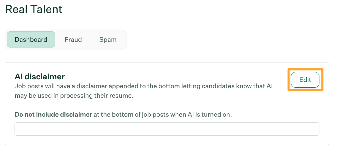 To update the disclaimer for your job post, go to the Talent Matching settings page. (The settings page can either by found under Configure > Real Talent or clicking Open settings on the AI Tools page)