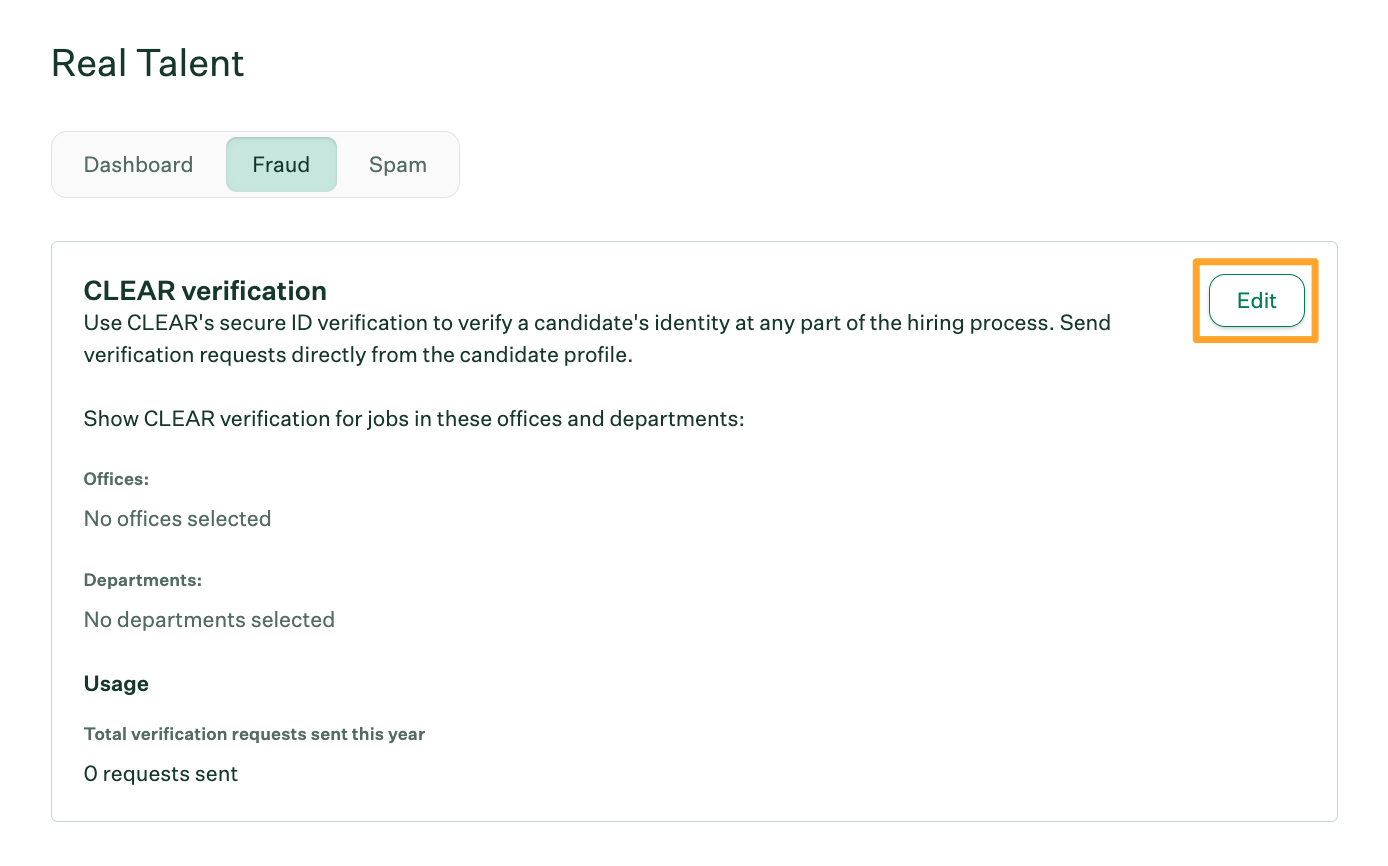 To begin, go to the Real Talent settings page. From there, update your offices and departments to specify where you want to enable CLEAR identity verification.