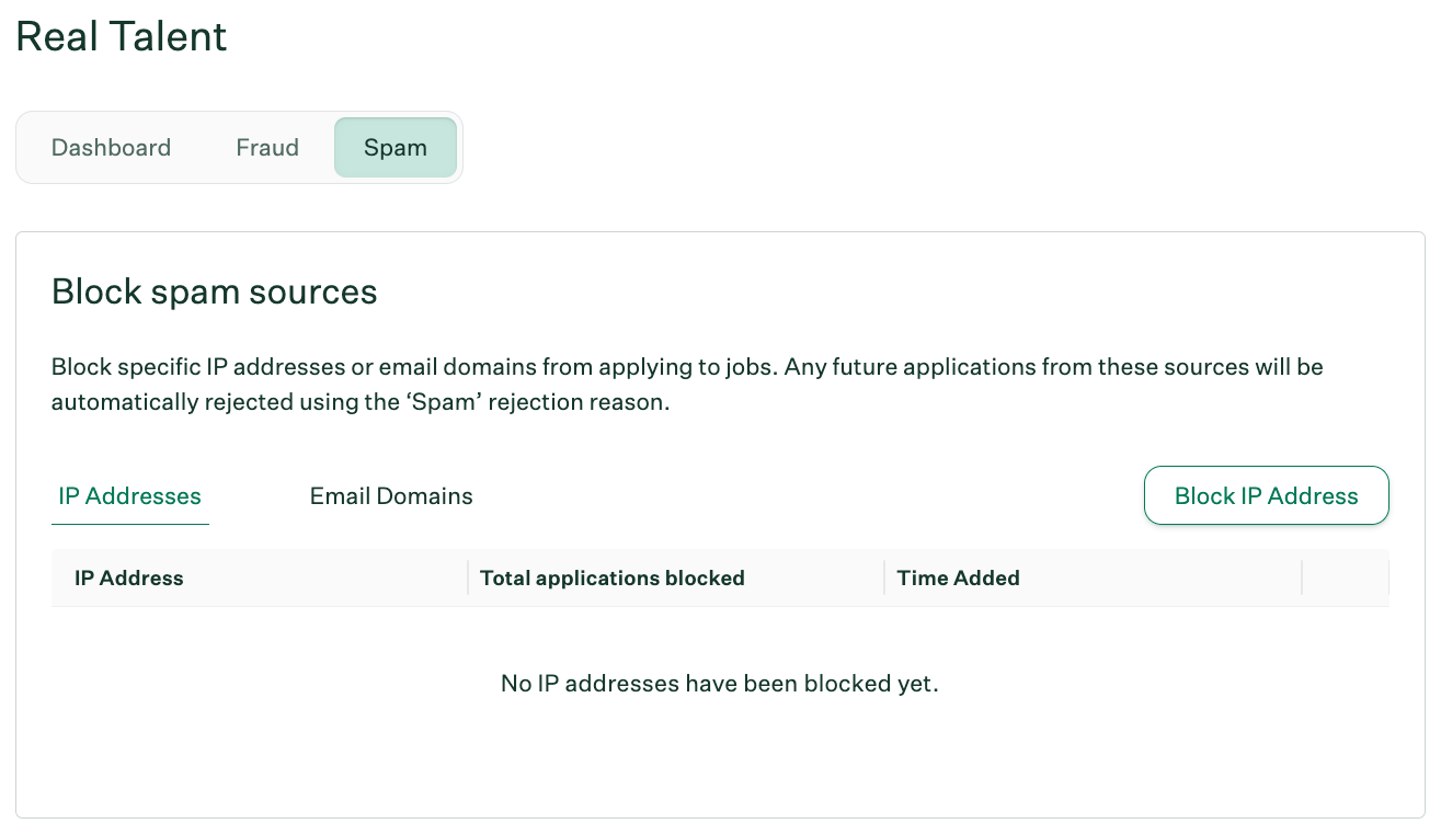 The IP address and email domain blocklist can be configured on Configure > Real Talent > Spam. Follow the instructions on the page to add addresses or email domains to be blocked as spam.