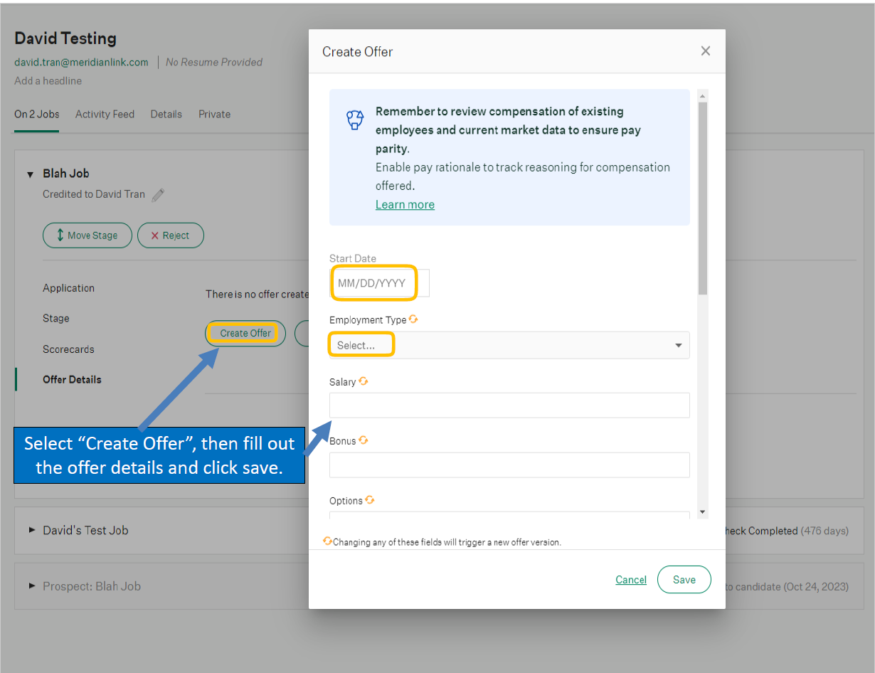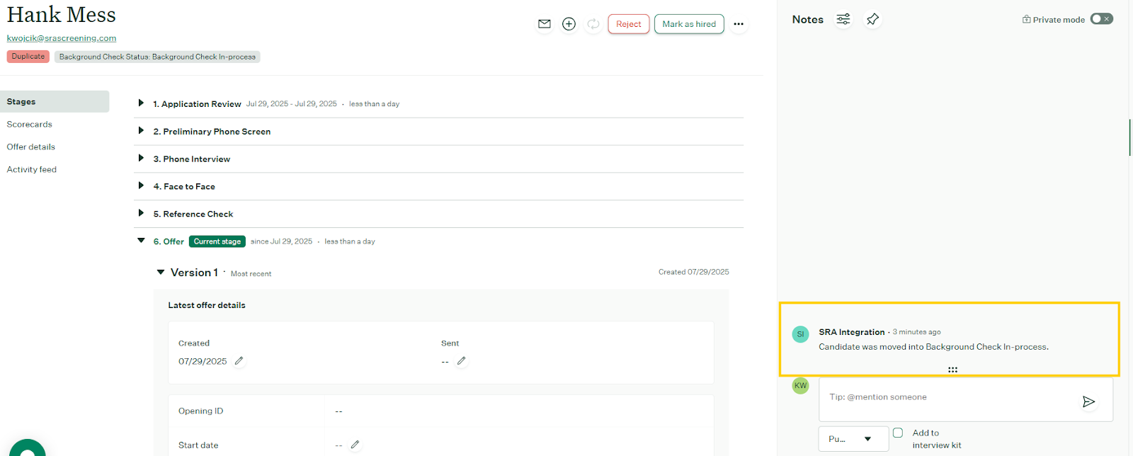 After Creating the Offer, you will see a note stating that the candidate’s background check is in Process: