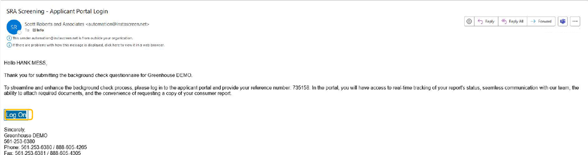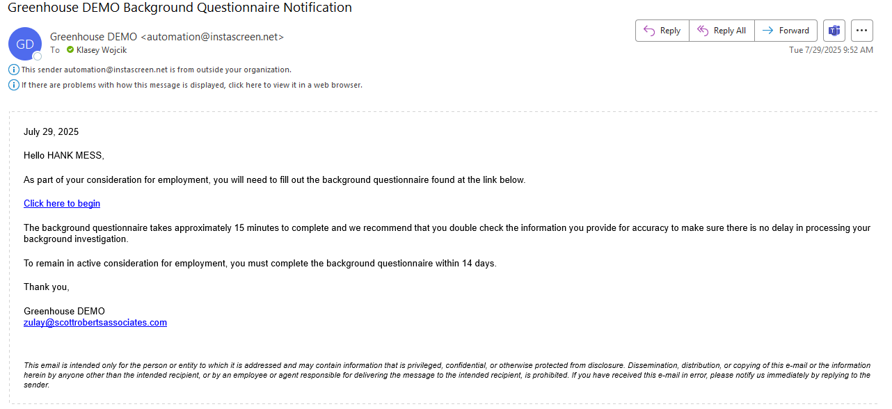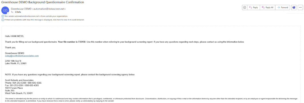 After Questionnaire is completed by applicant, a confirmation email is sent that verifies that the background check was received.