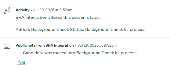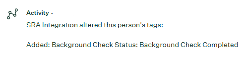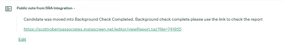 Once the order is complete, you will see a note stating “Background Check Status: Background Check Completed. A link to the completed report will be added as a note.