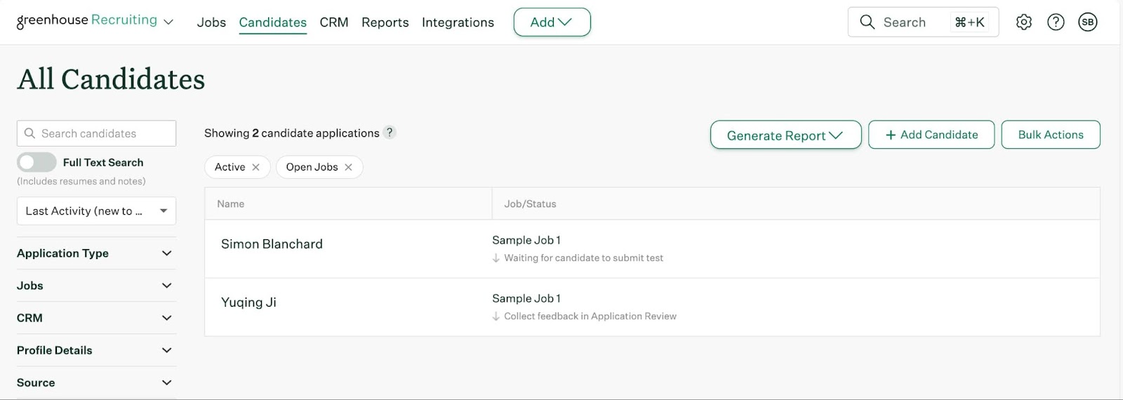 After it has been sent, an assessment’s status will display in Greenhouse Recruiting.