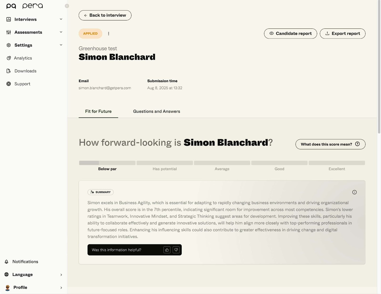 To see the candidate’s result in Pera click “Go to test”, an example of a Pera candidate report is shown below. The Pera assessment results can be configured to display a score in the range 0 - 100 or as a description, for example, “Excellent”.