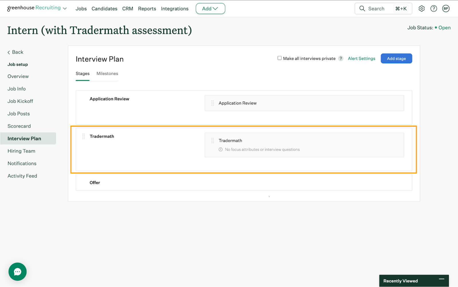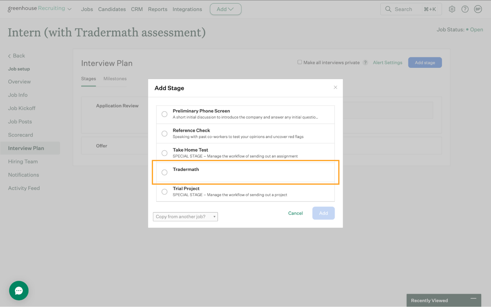 Once the Tradermath integration is enabled for your organization, you will be able to add the Tradermath assessment as an interview stage.