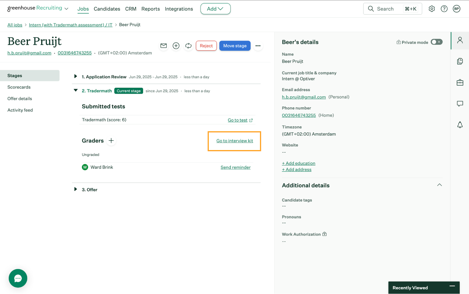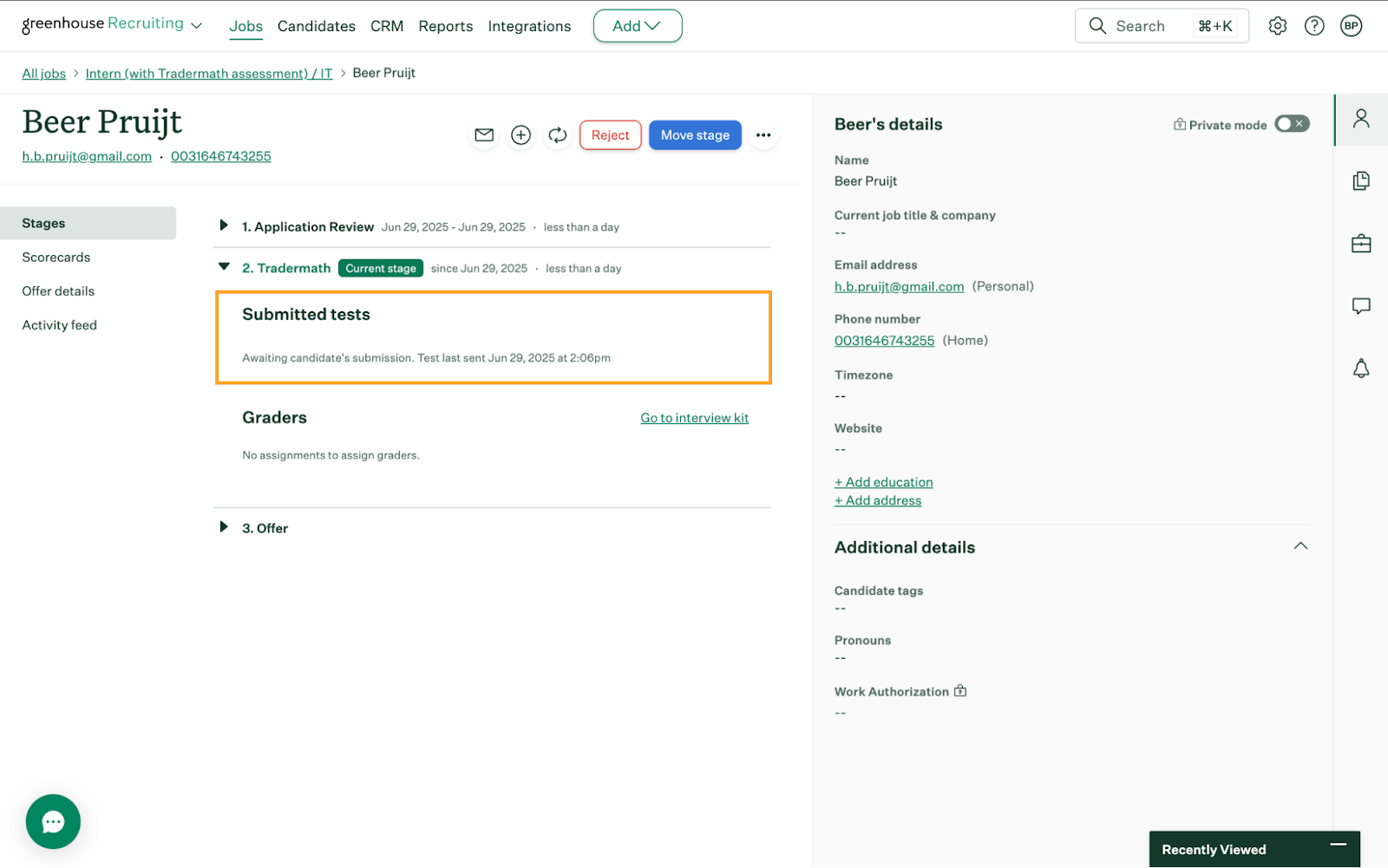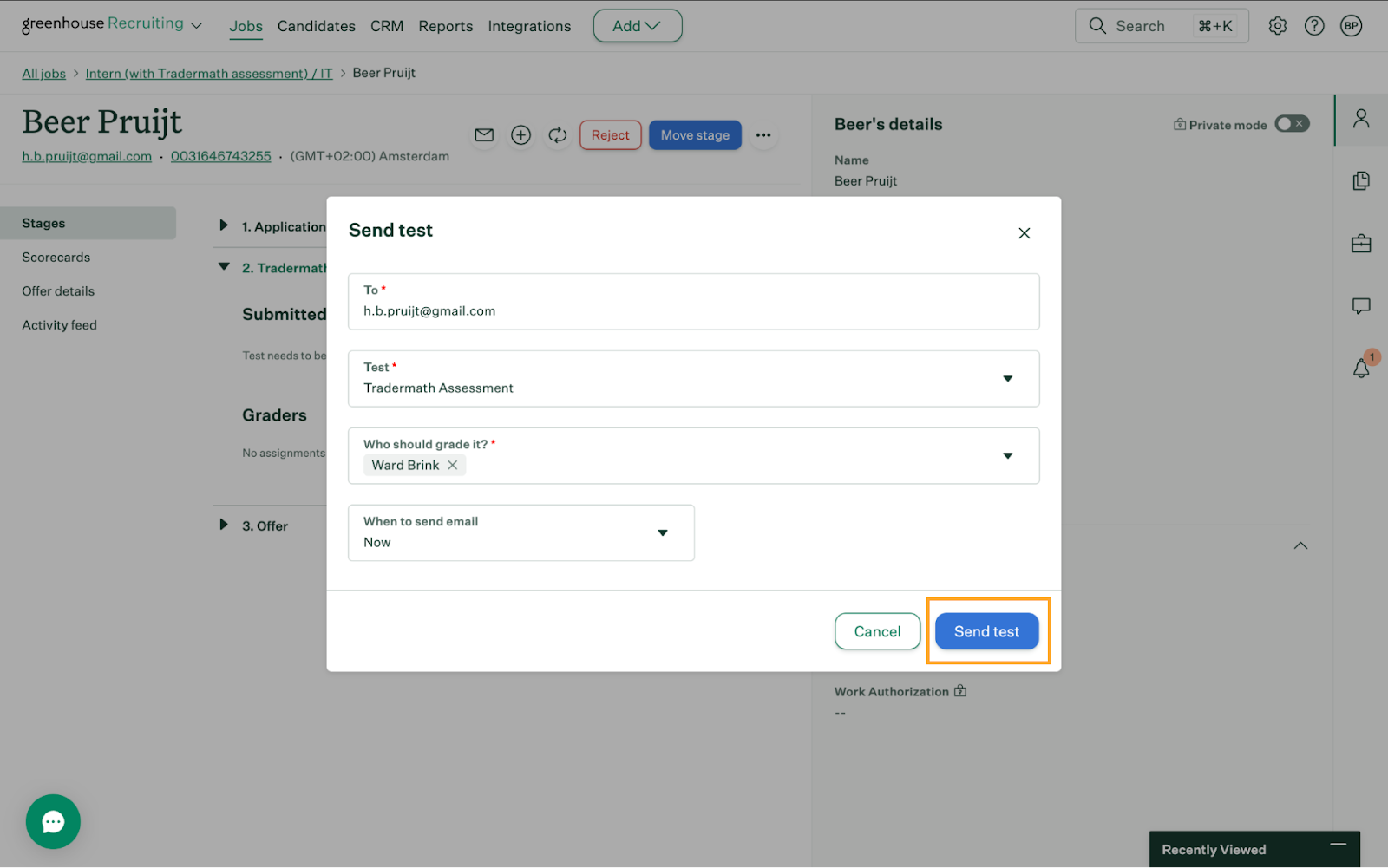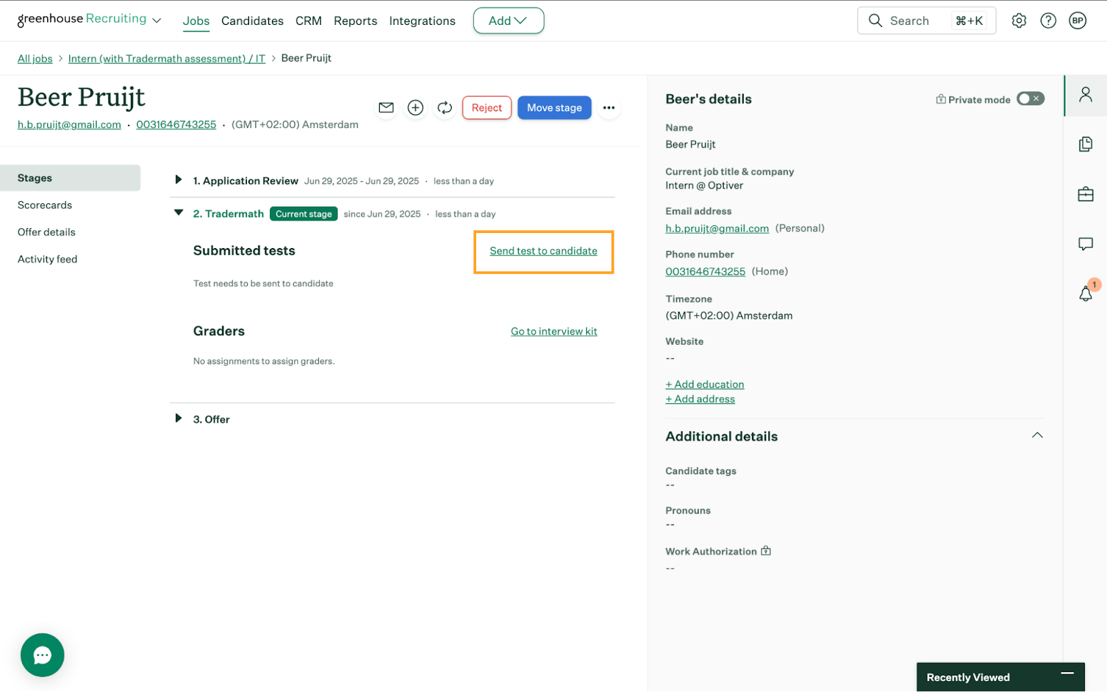 You can send an assessment to a candidate by selecting the Send Test button next to the interview stage. The assessment instructions will be sent by Tradermath.