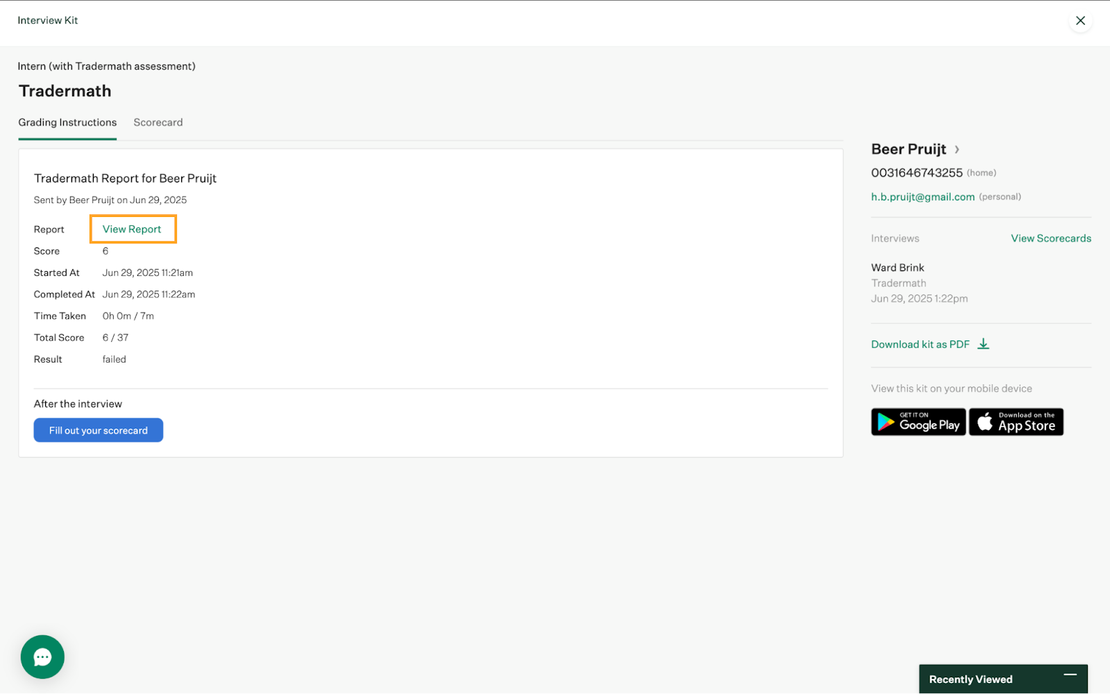 Once the candidate has submitted their test, the Interview Kit will contain a link to view the submitted test in the Tradermath application.