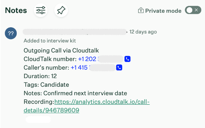 After each call, CloudTalk adds a Note on the candidate. The note includes: