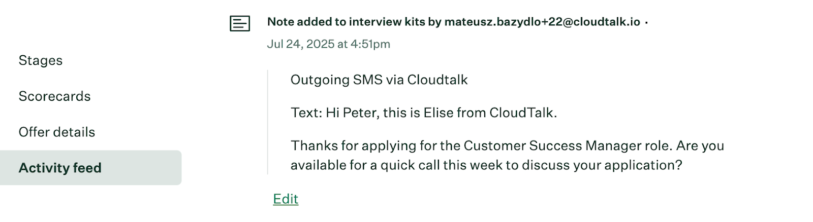 All inbound and outbound SMS messages sent through CloudTalk are logged to the candidate’s activity history in Greenhouse and linked to their primary job listing whenever possible.