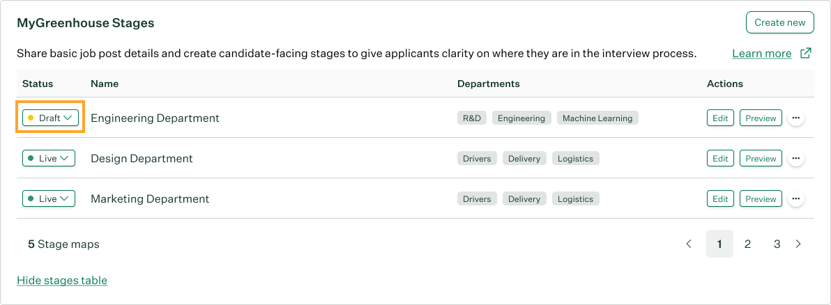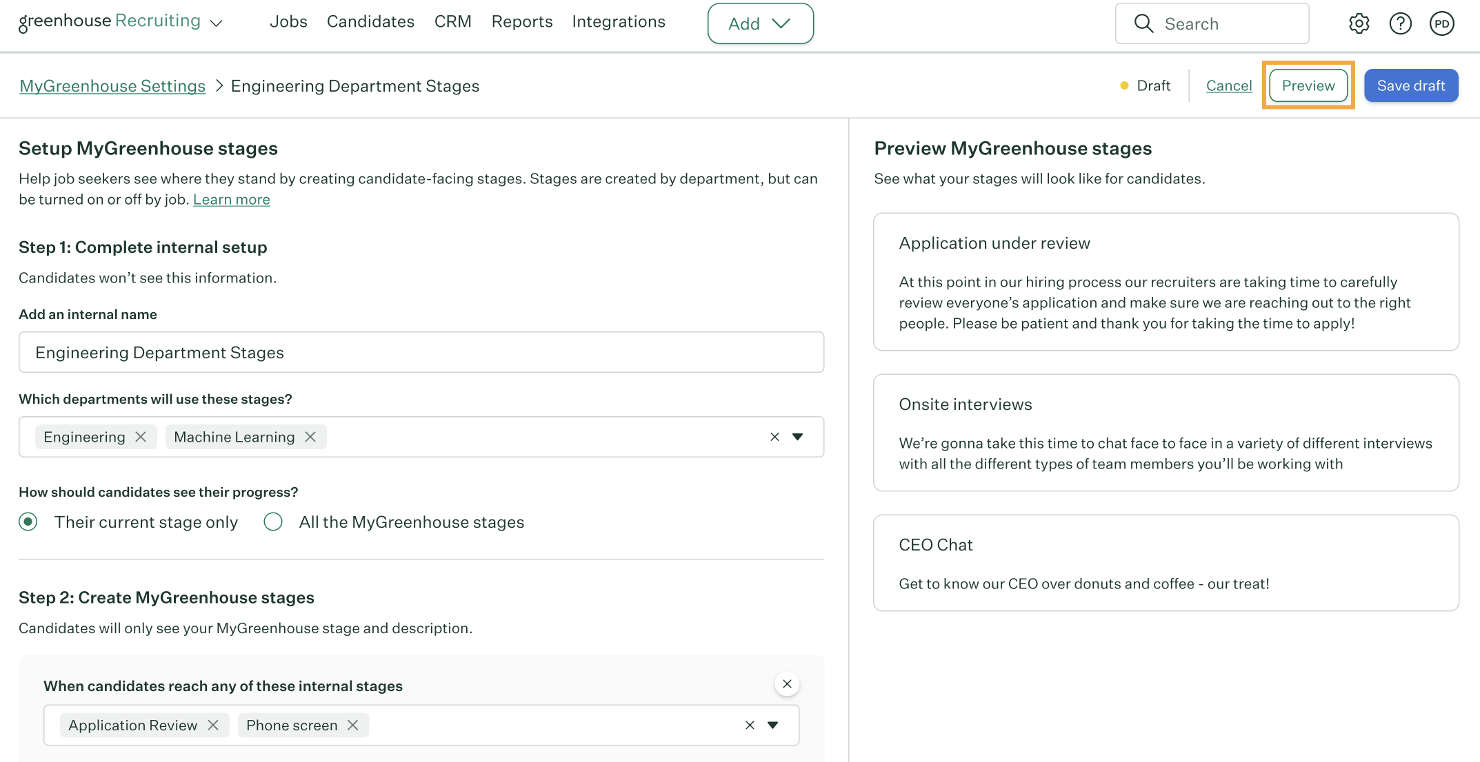 When you're happy with your setup, save your draft. Then, return to MyGreenhouse Settings to enable your new MyGreenhouse Stages.
