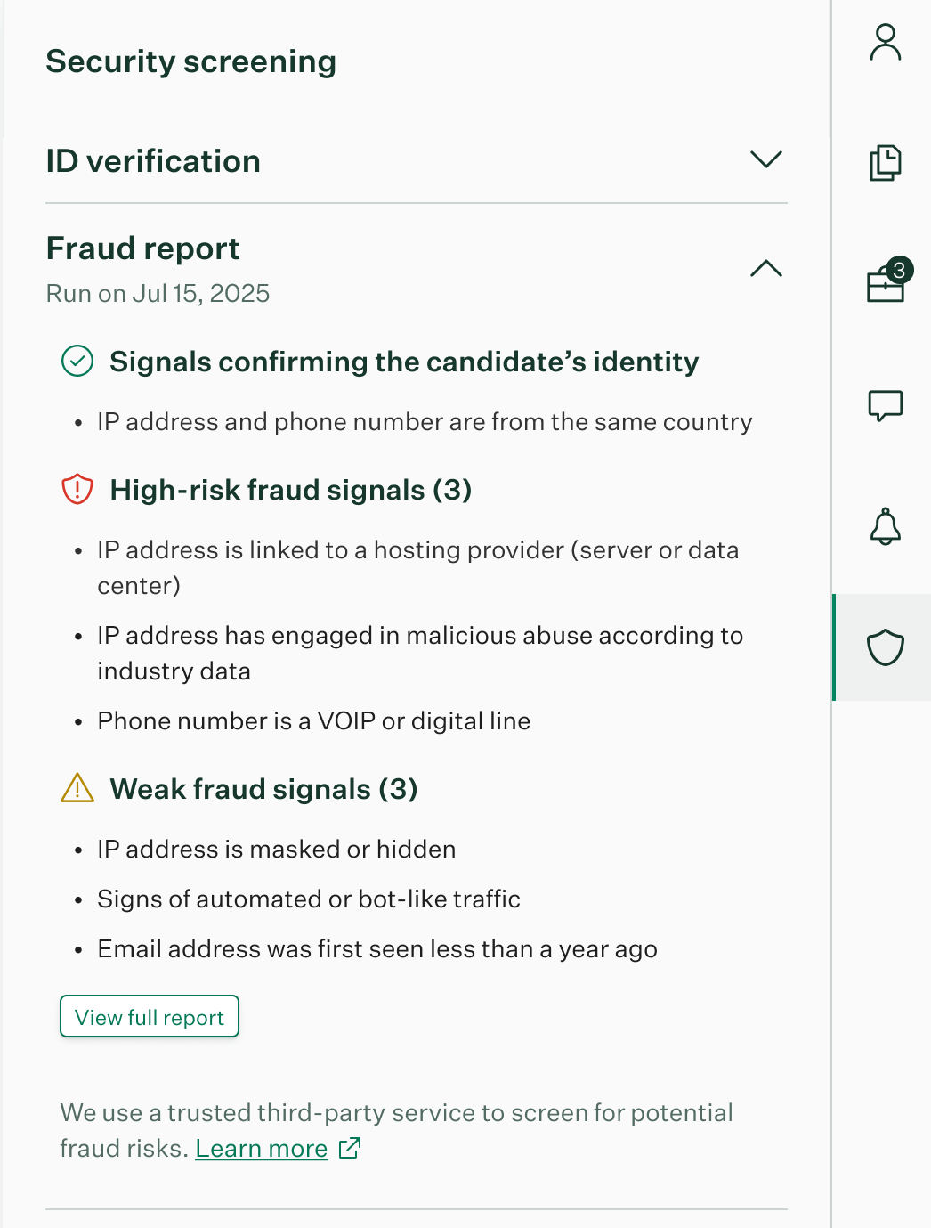 If a fraud report has been run for the candidate, you’ll see information about any fraud signals detected when the report was generated.