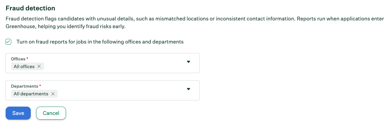 Choose which offices and departments should have fraud detection.