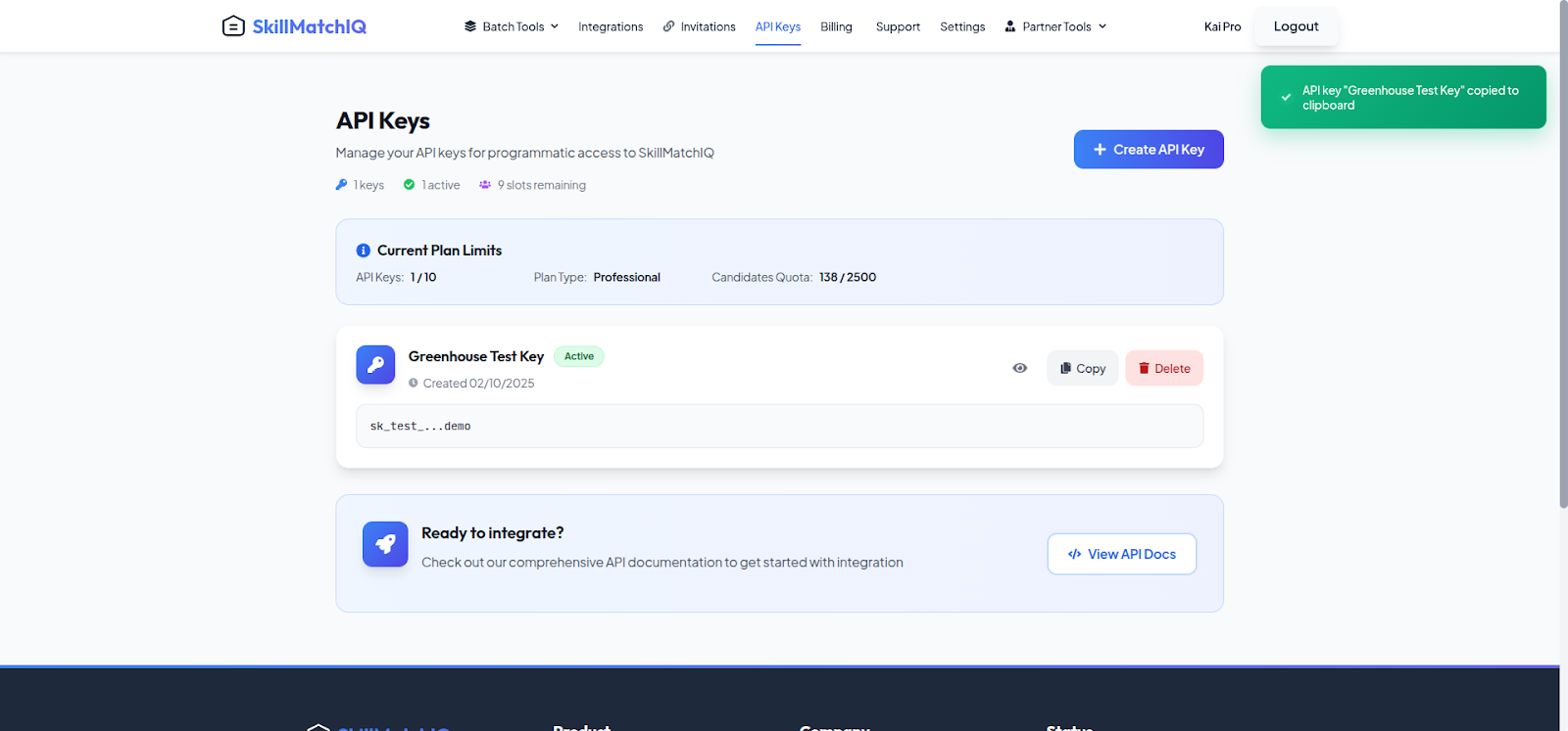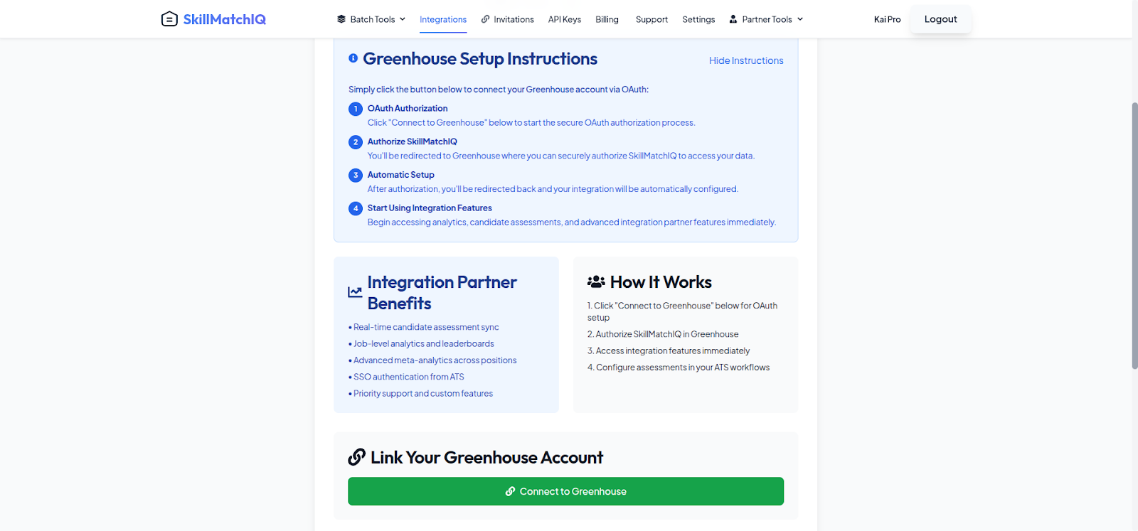 A: The Assessment API Key is what you provide to Greenhouse so they can request assessments from SkillMatchIQ. The OAuth connection is what you authorize from within SkillMatchIQ to grant us permission to write the detailed results (notes, tags, custom fields) back to your Greenhouse account. Both are required for the integration to function fully.