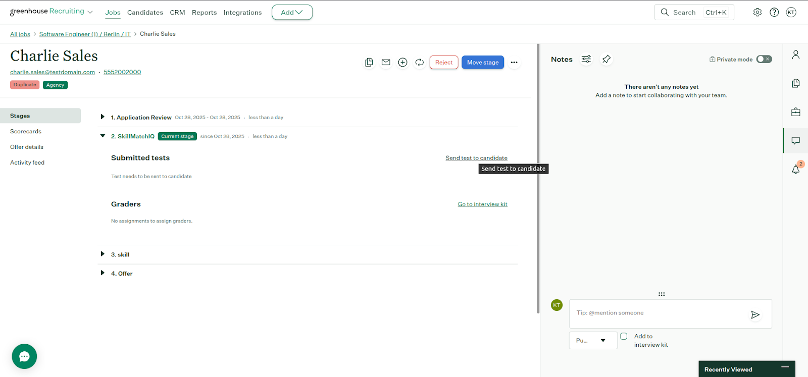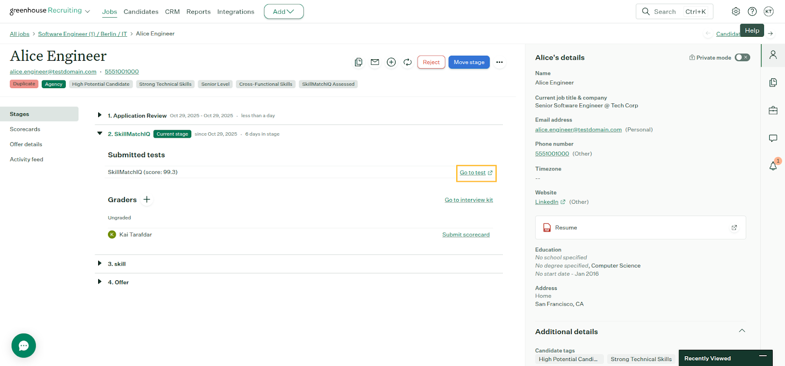 From a candidate's profile in Greenhouse, move them to the SkillMatchIQ Assessment stage.
