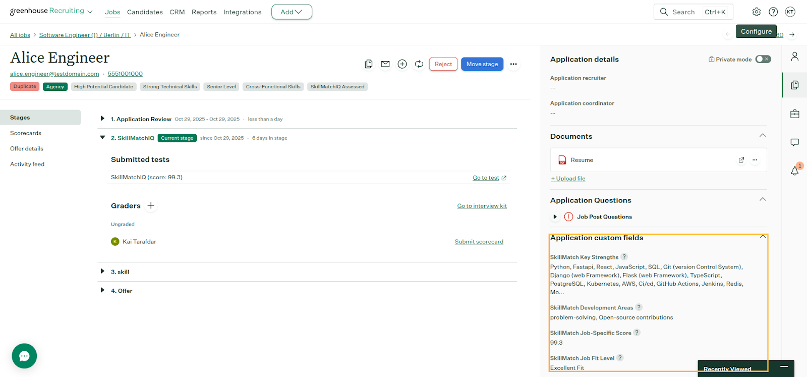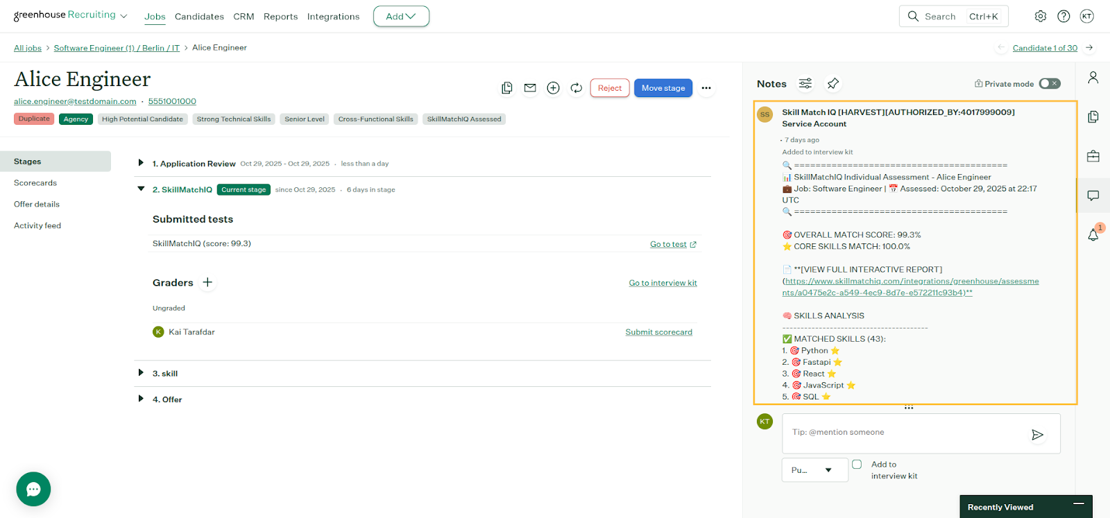 The SkillMatchIQ integration with Greenhouse Recruiting allows your team to seamlessly trigger an AI-powered analysis directly from the Greenhouse interface. Results, including scores, detailed notes, and filterable tags, are automatically pushed back to the candidate's profile, keeping your entire workflow within Greenhouse.