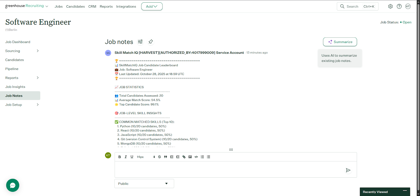 - Content: This note contains a ranked list of all assessed candidates for that job, sorted by their overall match score. It also includes job-level insights, such as the most common skills and gaps across all candidates for that specific role.