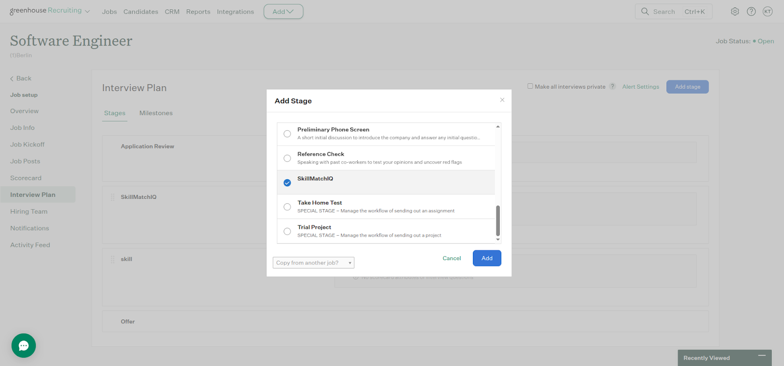 To use the integration, you must add the "SkillMatchIQ Assessment" stage to a job's Interview Plan in Greenhouse.