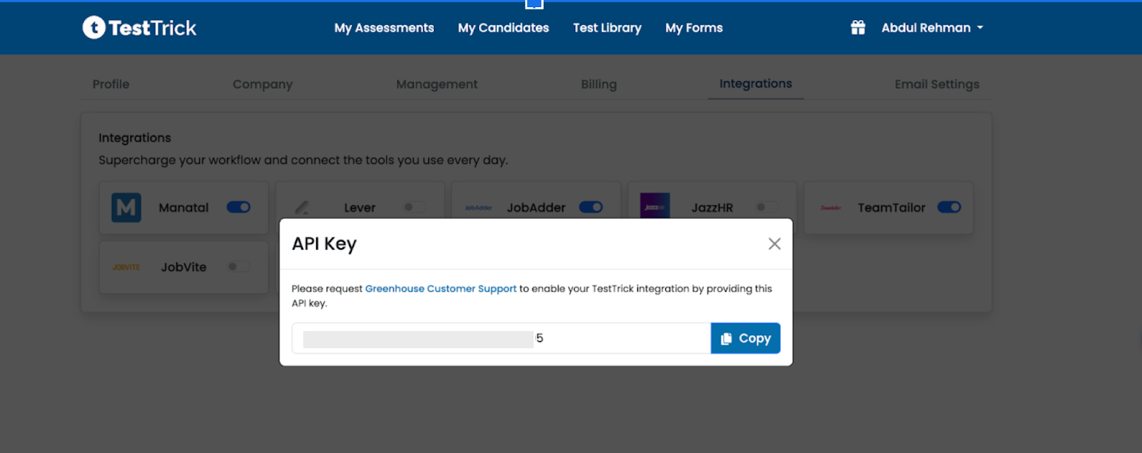 To Enable the integration you first have to authenticate TestTrick with your Greenhouse account. To retrieve the testtrick API key, follow these steps: