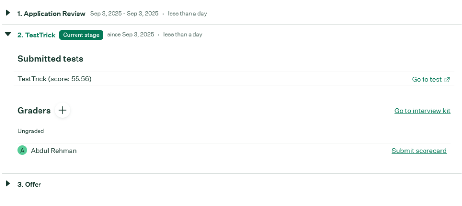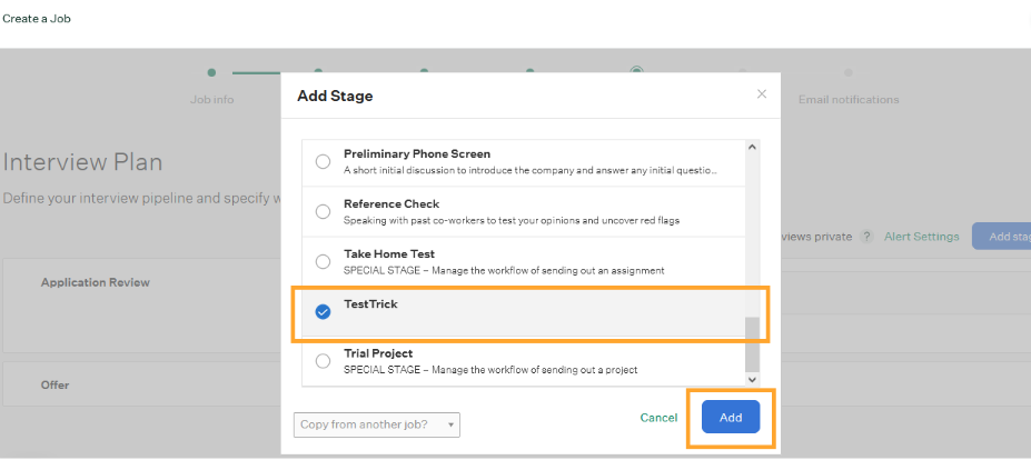 Once the Testtrick integration is enabled for your organization from Testtrick settings, you will be able to add the Testtrick assessment as an interview stage.