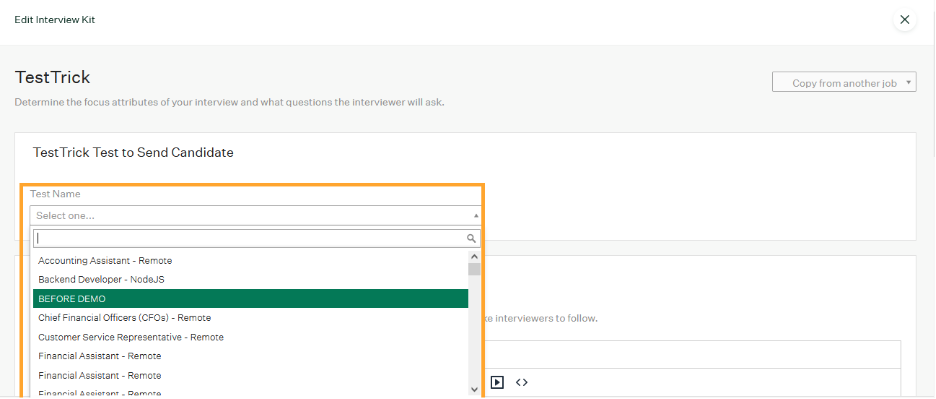 TestTrick’s integration with Greenhouse Recruiting allows you to seamlessly add Testtrick’s assessment to a job's interview plan.