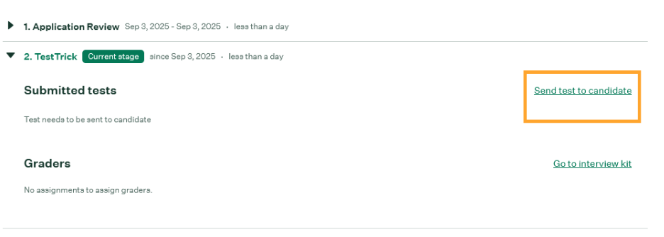 You can send an assessment to a candidate by selecting the Send Test button next to the interview stage. The assessment instructions will be sent by Testtrick.