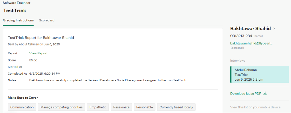 Once the candidate has submitted their test, the Interview Kit will contain a link to view the submitted test in the Testtrick application.