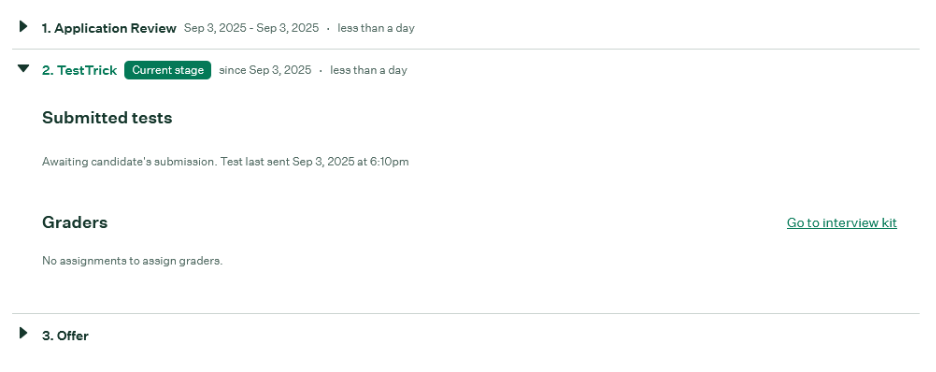 After it has been sent, an assessment’s status will display in Greenhouse Recruiting.