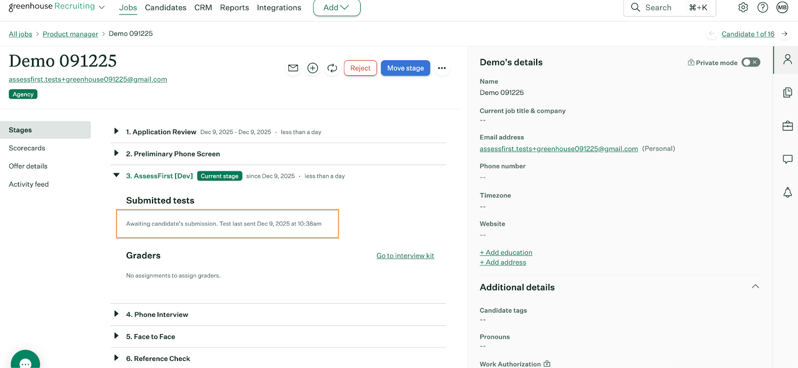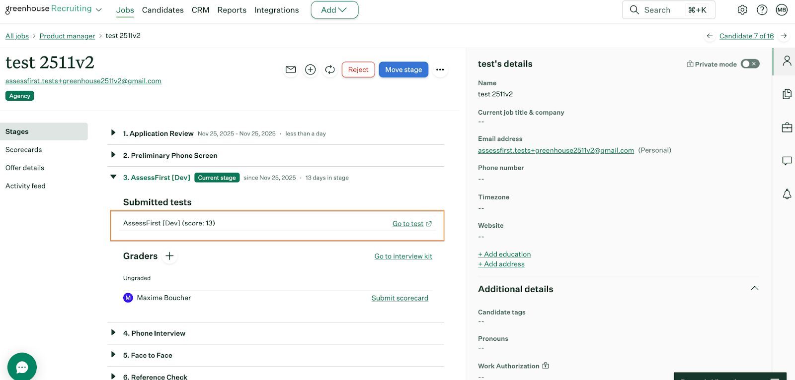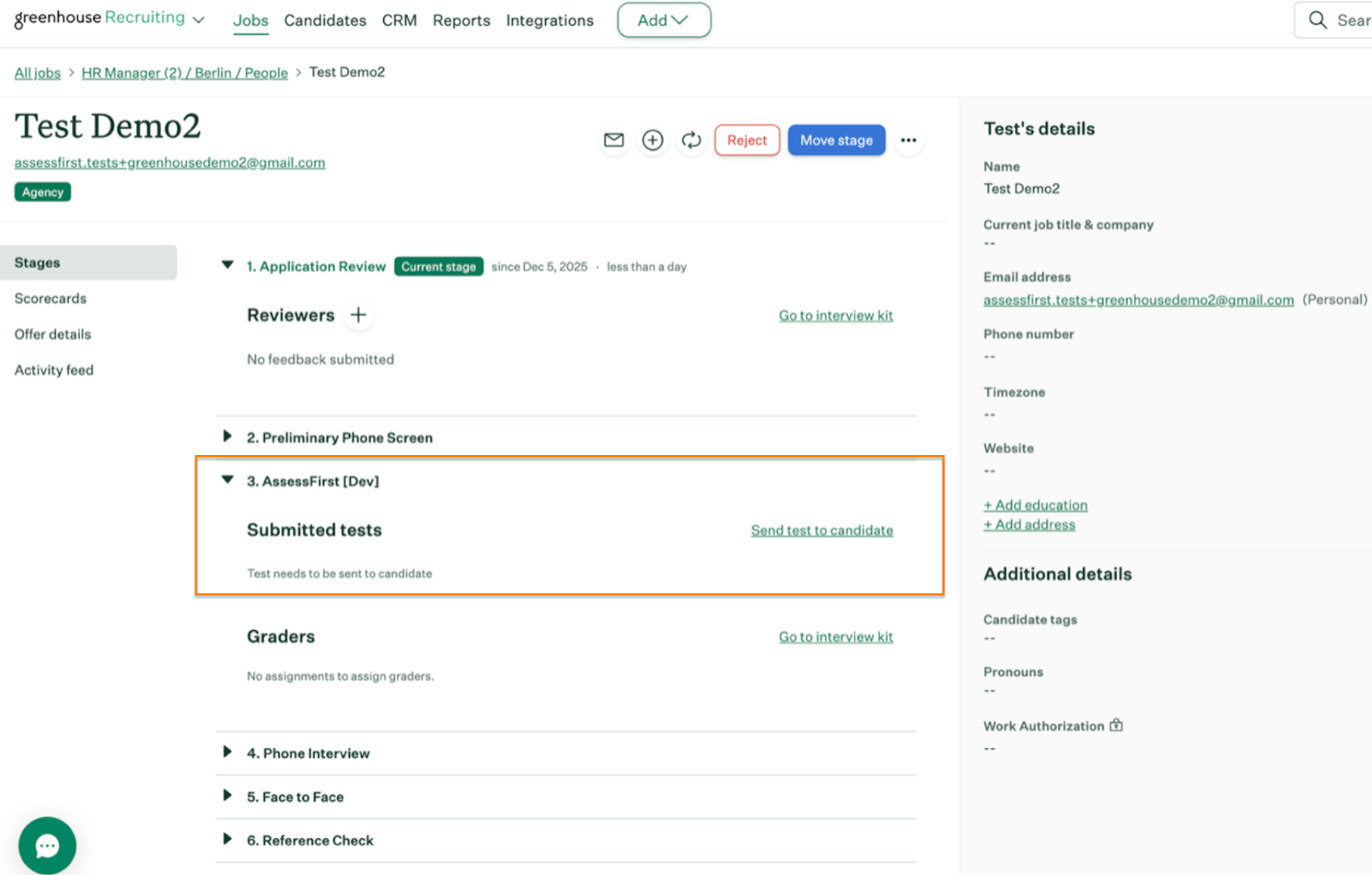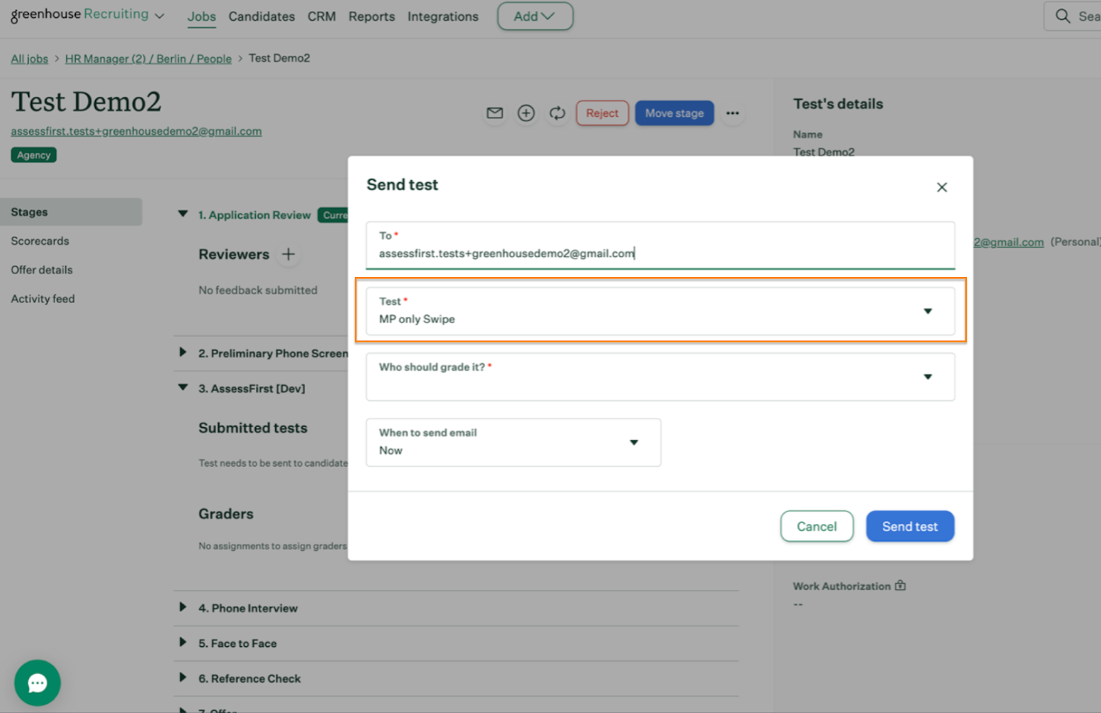 You can send an assessment to a candidate by selecting the Send Test button next to the interview stage. The assessment instructions will be sent by AssessFirst.