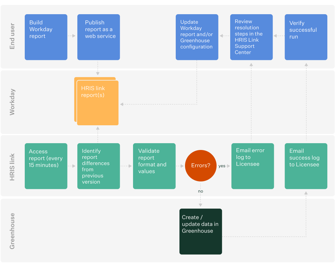 Greenhouse can assist in the diagnosis of errors that occur in HRIS Link as outlined by the workflow detailed above.