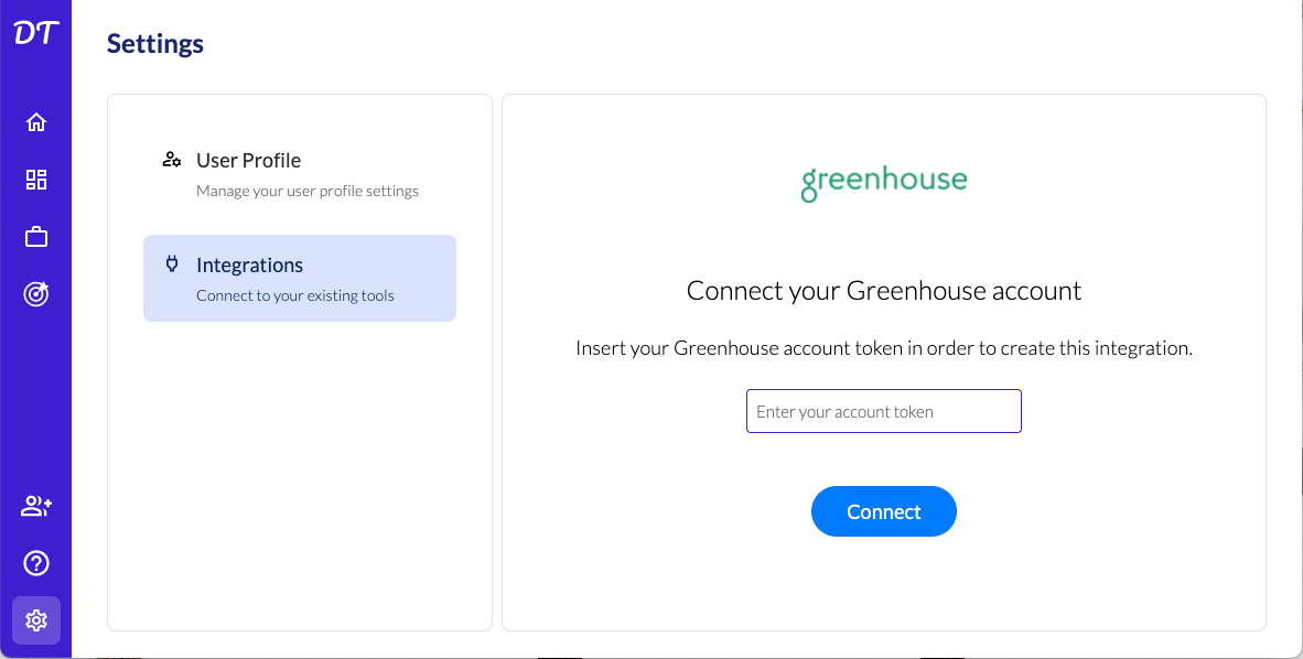 With your Harvest API key copied from Greenhouse Recruiting, you're ready to enable the DreamTeam integration. Paste your Harvest API key to your DreamTeam’s account by selecting Account Settings > Integrations > then select Greenhouse.