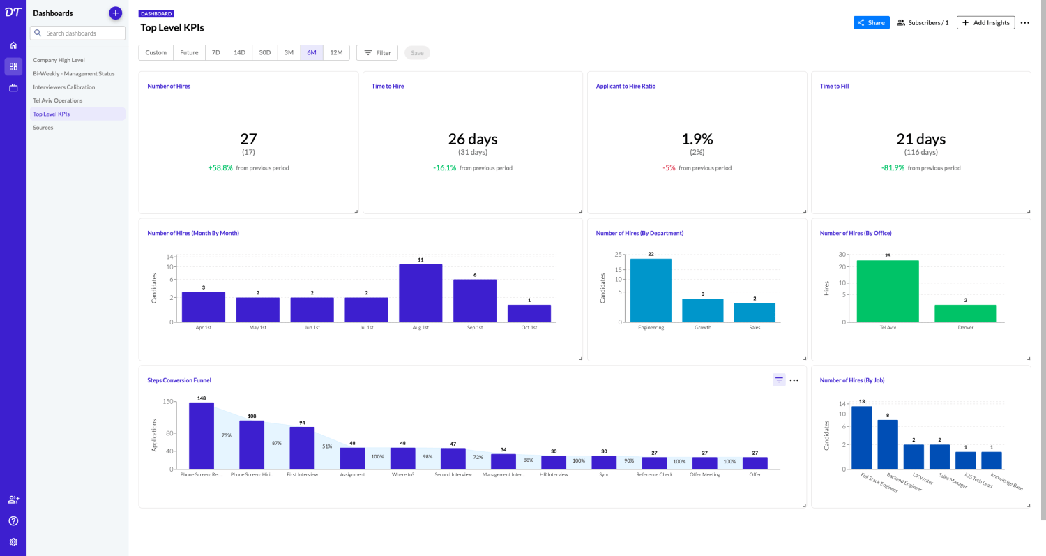 After entering the API Key on DreamTeam, your Greenhouse Recruiting data will be synced with DreamTeam’s intelligence platform and ready to use within a few minutes. You can start using preset dashboards, built specifically for the HR and recruiting industries by DreamTeam experts.