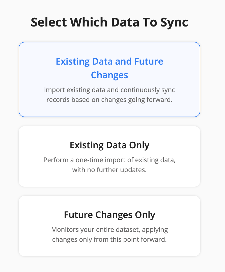 For each sync, you'll need to select whether to sync existing records, future changes, or both.