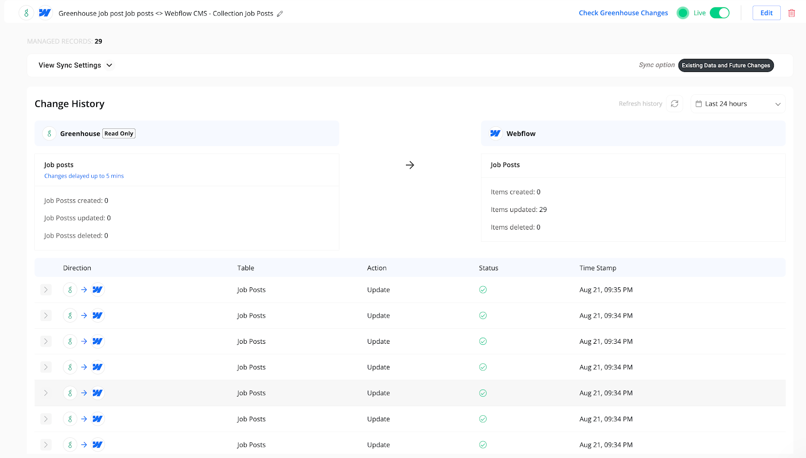 Create a beautiful, always up-to-date careers page by syncing your Greenhouse job posts directly to Webflow CMS, without touching a single line of code. When you publish, update, or close a job posting in Greenhouse, the changes automatically reflect on your Webflow careers page in real-time.