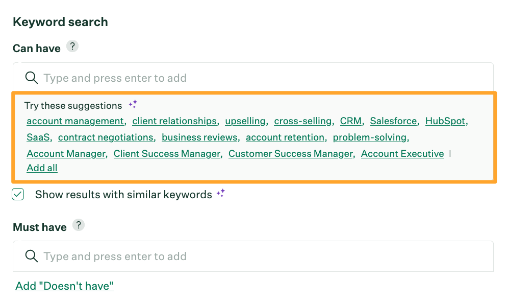 This takes the information from your job post and suggests specific keywords that may be helpful filters. Select a keyword to add it to the list.