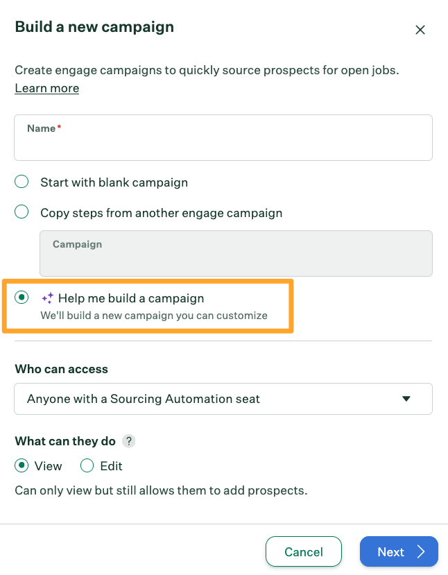 To create a campaign using AI, open Greenhouse Sourcing Automation and create a new engage campaign.