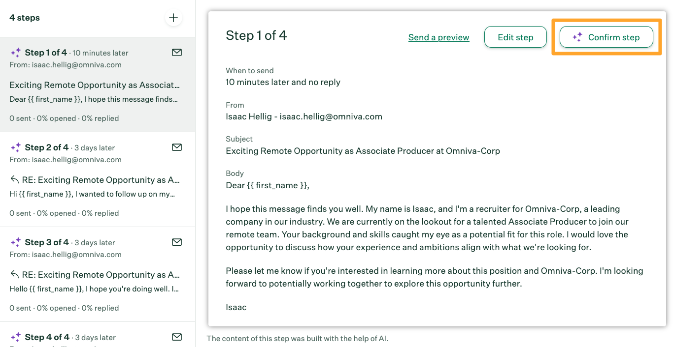 After a campaign is created, you'll need to approve each step before it can be sent. Any steps that were created using AI will have a purple icon next to them. You can approve the steps one at a time, or all at once when you're ready to launch the campaign.