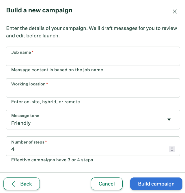 You'll need to enter some basic details for the campaign to help generate the initial draft, such as the job name, number of steps, or overall tone.