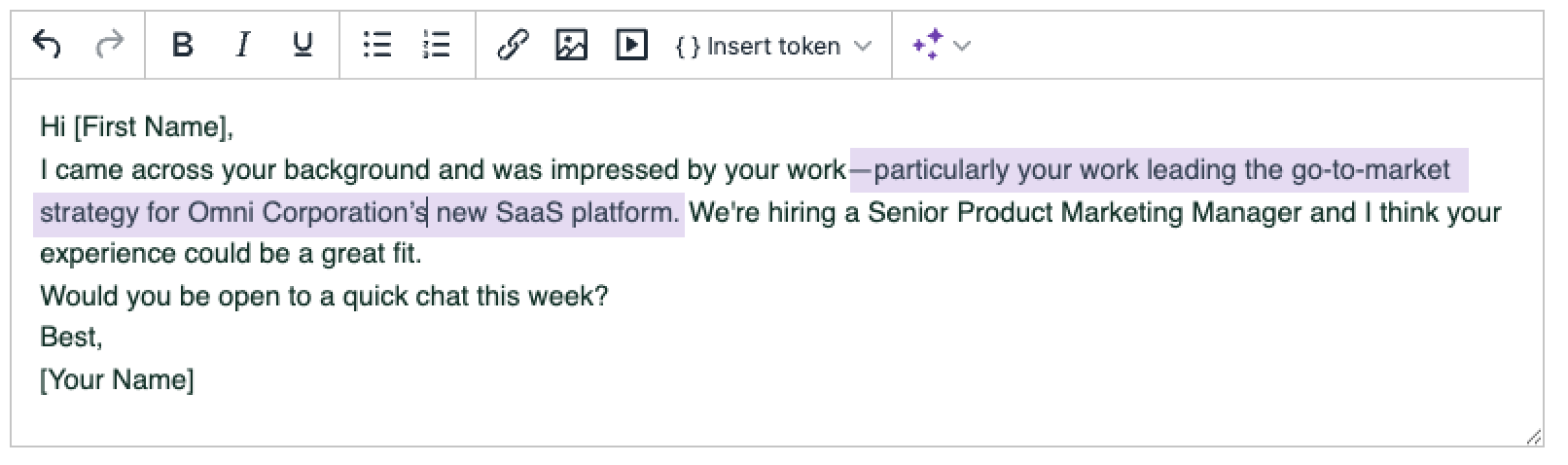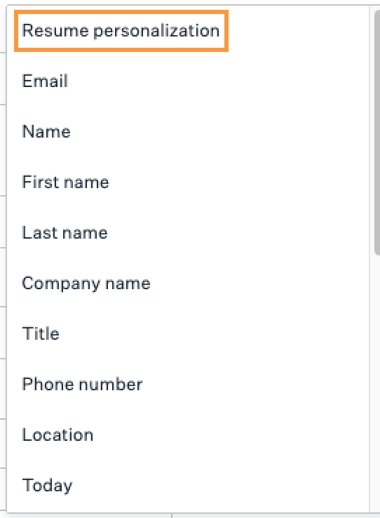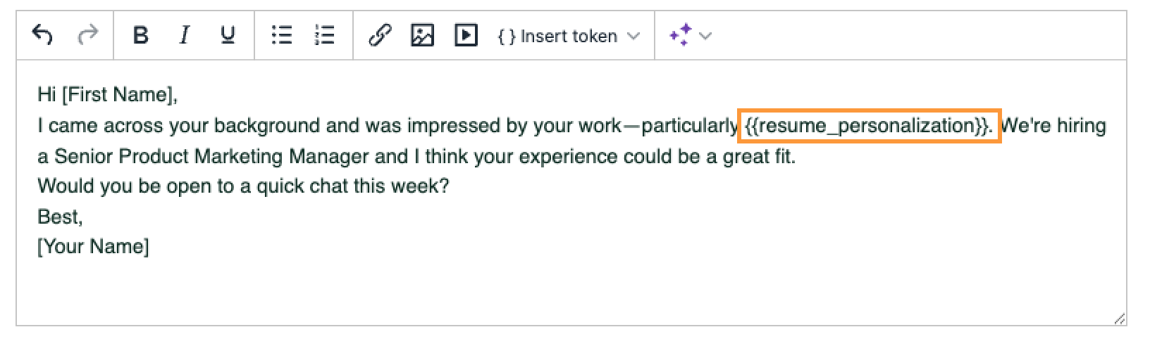 The resume personalization token helps you save time and create more relevant outreach by automatically pulling key details from a prospect’s resume—like their job title, experience, or skills—directly into your outreach messages. Just insert it into your message, and AI will take care of the rest.