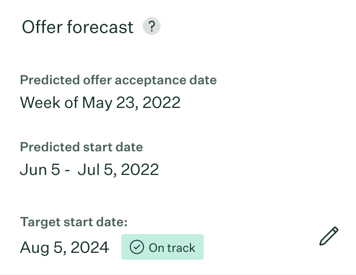 Set a target start date for your job opening, and offer forecast will project an anticipated offer acceptance date, as well as a predicted start date for the new hire.